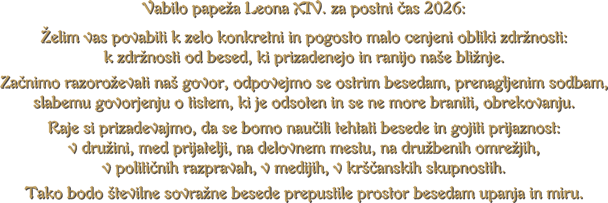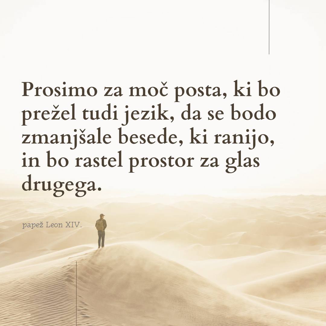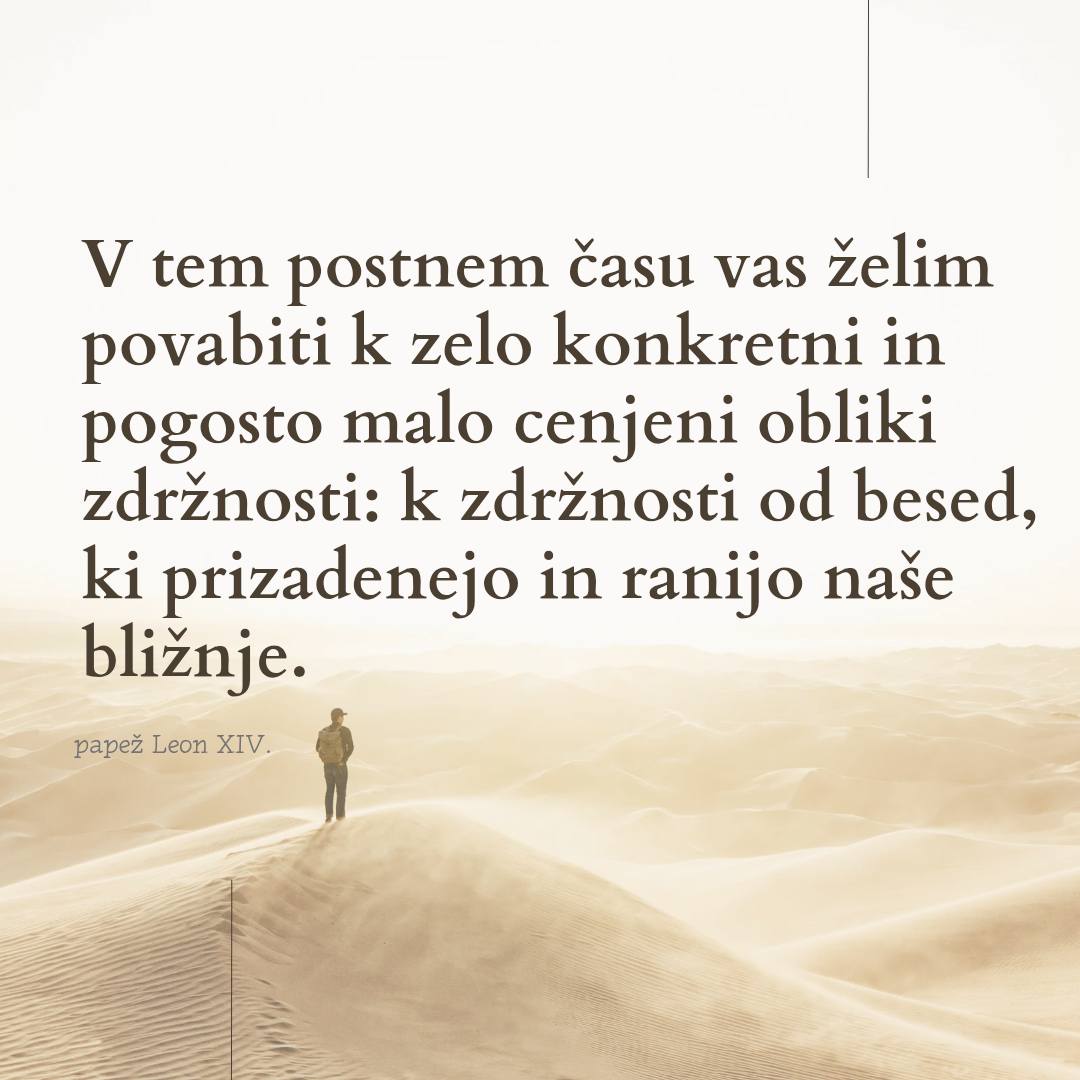 Papeževa poslanica za postni čas 2026: Poslušanje in post. Post kot čas spreobrnjenja Sveti oče: Postni čas kot priložnost za spreobrnjenje in notranjo prenovo Sveti oče: Molitev, dobrodelnost in post niso zdravilo samo za nas, ampak za vse Papež Frančišek: Gospod nas vabi, da očistimo svoj pogled in svoje govorjenje Papeževo sporočilo za postni čas: Ugoden čas za sejanje dobrega zaradi žetve Duhovne misli cerkvenih očetov, Benedikta XVI. in papeža Frančiška za pepelnično sredo Sveti oče: Molitev, dobrodelnost in post niso zdravilo samo za nas, ampak za vse Papež Frančišek: Gospod nas vabi, da očistimo svoj pogled in svoje govorjenje Papeževo sporočilo za postni čas: Ugoden čas za sejanje dobrega zaradi žetve